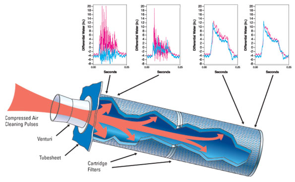 ExtraLife脈沖清灰系統采用專有的模擬脈沖清灰技術來設計,令粉塵可以輕松地從濾筒表面吹掉,從而提高過濾效率,延長濾材的使用壽命。圖中紅色曲線顯示ExtraLife系統在DFO前排濾筒產生的壓力增加。而藍色曲線則表示普通濾筒的脈沖反吹表現。
